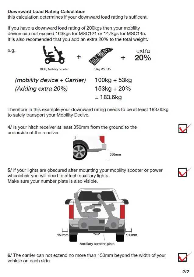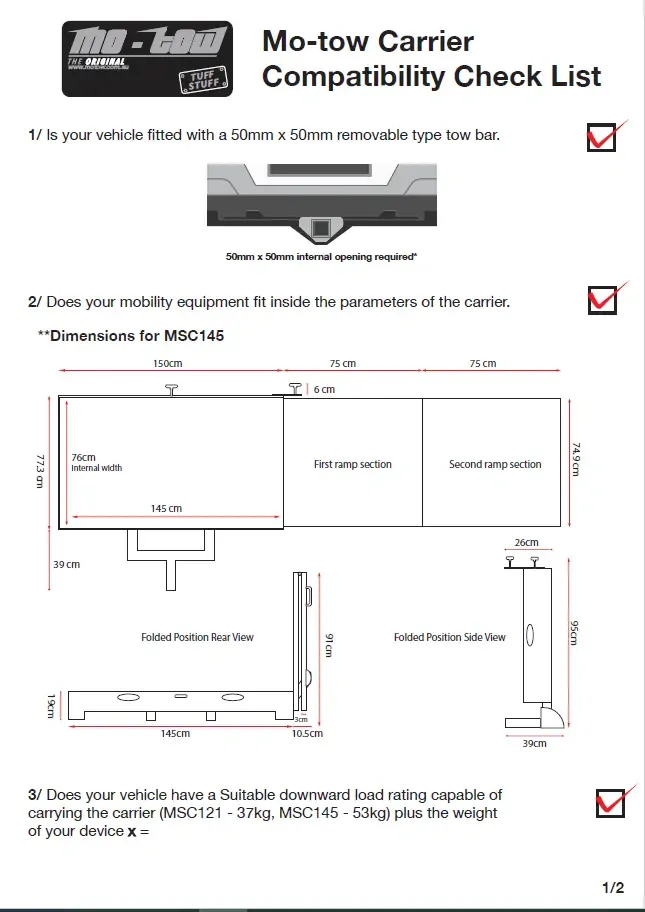 - Will my vehicle be able to carry the combined weight of the scooter/wheelchair and the Mo-tow carrier ( 53kgs) . To ascertain this you will need to know the downward load rating for your vehicle
