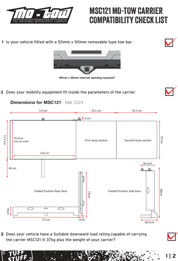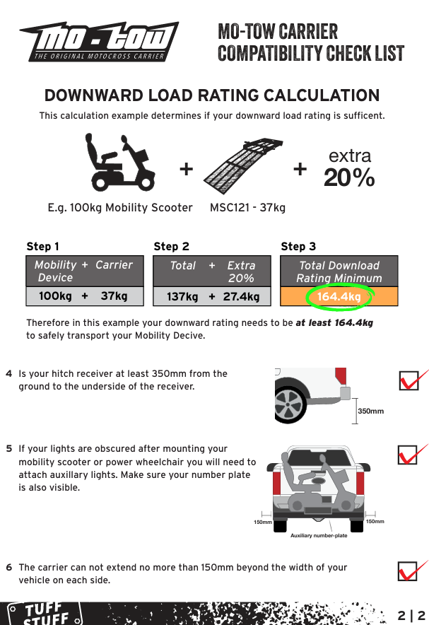 - Will my vehicle be able to carry the combined weight of the scooter/wheelchair and the Mo-tow carrier ( 40kgs) . To ascertain this you will need to know the downward load rating for your vehicle